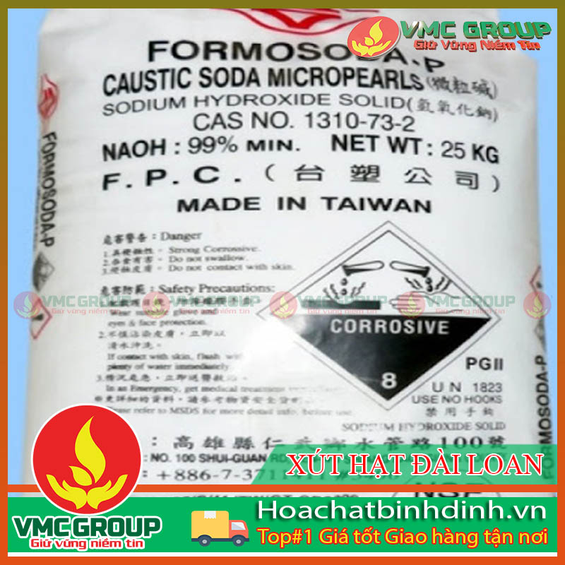 XÚT HẠT ĐÀI LOAN 99%-HCBDTên gọi khác: Xút Hột, Xút Bột, Caustic Soda Micropearls, NaOH Hạt, NaOH Hột, NaOH Bột, Natri Hydroxit, Sodium Hydroxide, Caustic Soda, Xút ăn da, Sodium Hydroxide |
