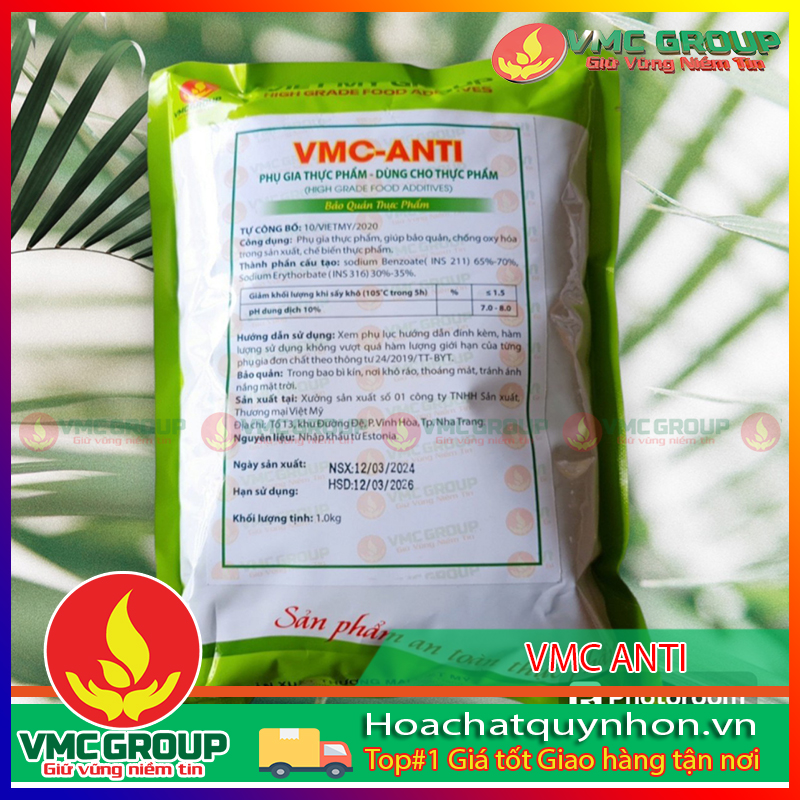 - Gọi VMC Anti là siêu bảo quản vì nó được sử dụng cho hầu hết các thực phẩm (trừ các sản phẩm từ thịt) bảo quản cho các sản phẩm nước tương, nước mắm, nước giải khát, bún mì phở, thạch, mứt quả, bánh kẹo, rau củ quả ngâm,…